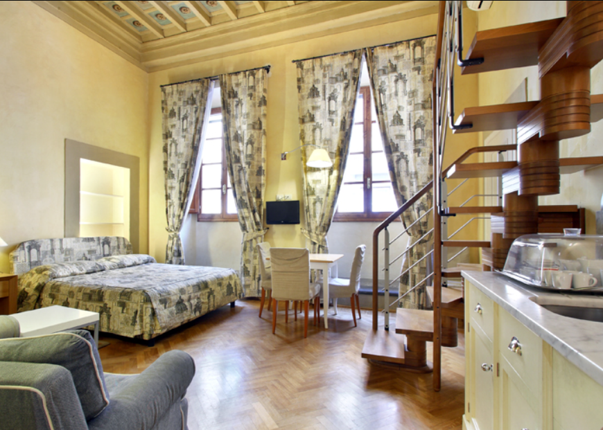 ドゥオーモとアカデミア美術館のすぐそばという絶好のロケーションで、フィレンツェ観光には最も便利の良いアパートです。キッチン付き、バスタブ完備のワンルームタイプで、ロフトスペースを利用すれば、4名様で快適にご滞在いただけます。同じ建物に同様のアパートが複数あるので、グループでのご宿泊にも便利です。ロケーションがとても良いのに良心価格なので、かなり早くから埋まってしまいます。ご希望の場合はお早めにご検討ください。