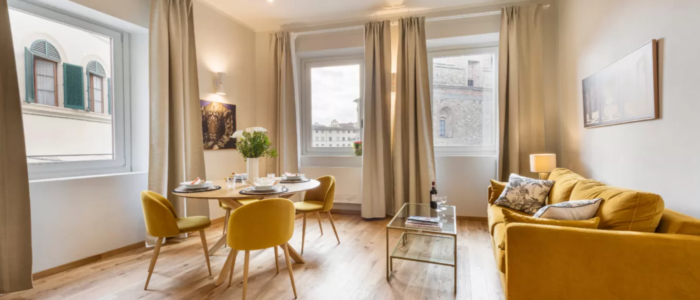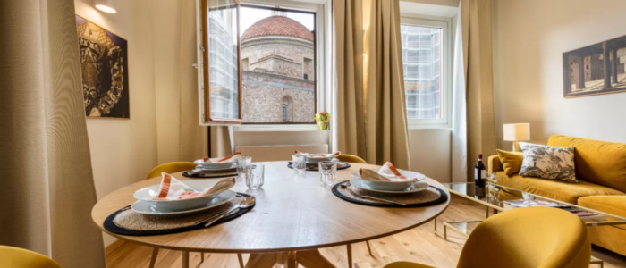 窓から見えるメディチ家礼拝堂と広場の景色がフィレンツェ滞在の気分を盛り上げてくれます。完全防音、エレベーター完備、オートロックの扉、の最新の設備を整えた快適なアパートです。2泊から滞在可能です。オフシーズン(1月から2月末、11月半ばから12月半ば)に1週間以上滞在すると、かなりお得です。