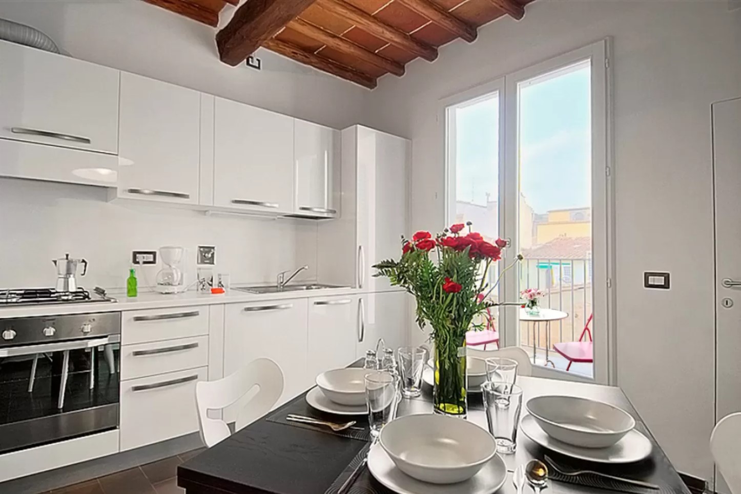 ミニテラス付き、明るいキッチンが魅力の広めのワンルームタイプです。おひとり様でも寂しくない間取りです。中央市場のすぐそばなので、フィレンツェで食材を買い込んで料理をしてみたい方にピッタリのアパートです。