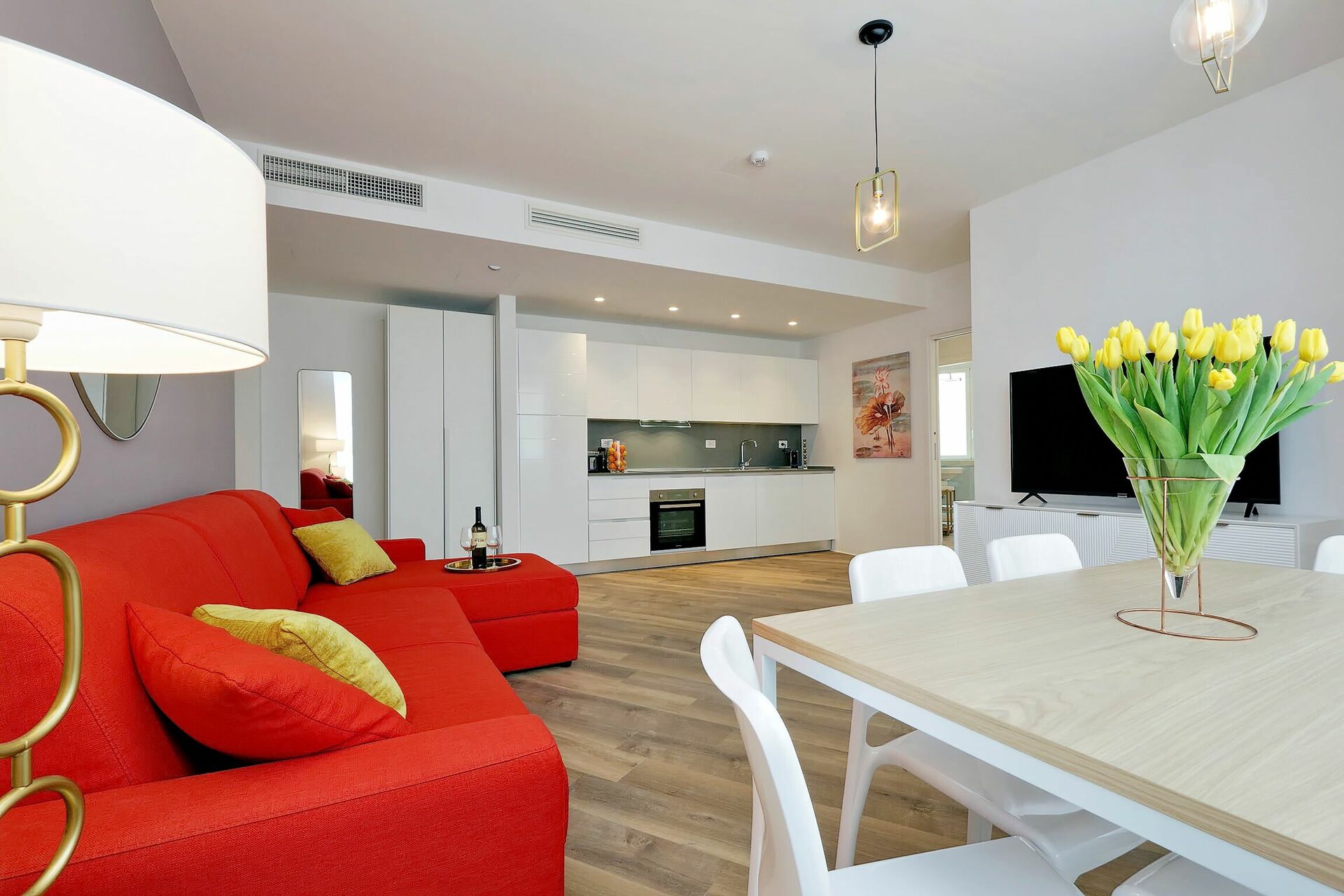 フローリング敷きの80㎡は、明るいリビング兼ダイニングスペース、寝室2部屋(ダブル1+ツイン1)、ソファーのあるリビングで構成されています。アパート内は禁煙です。