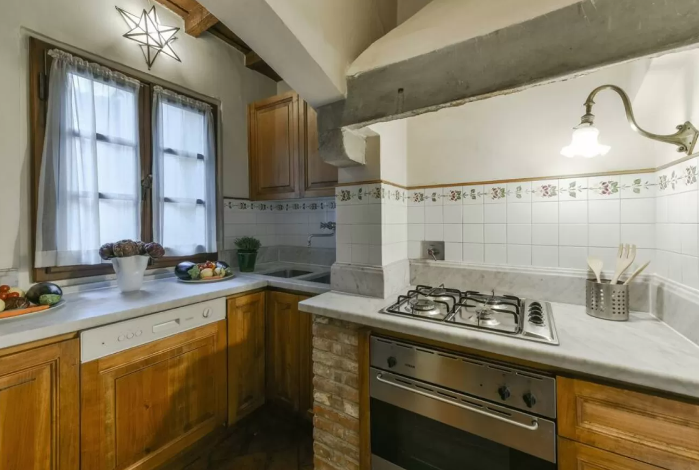 まるで美術館の中に泊まっているかのような歴史を感じさせるリビングが、歴史ある街フィレンツェ滞在の気分を盛り上げてくれます。そしてとっても使いやすくて可愛いトスカーナスタイルのキッチンもまたこのアパートの魅力のひとつ。