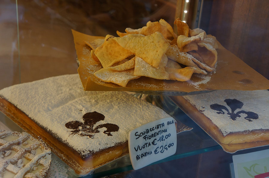 お菓子好きの方に欠かせないのが、この時期にしか食べられないスキアッチャータ・アッラ・フィオレンティーナ(Schiacciata alla Fiorentina) 。フワフワのスポンジケーキに粉砂糖をかけただけの素朴なお菓子です。クリーム入りもありますが、私はプレーンな方が好き。お菓子屋さんやパン屋さんで一人分ずつ四角く切ってくれます。大きな揚げ餃子のような、サクサクのキアッキエレ(Chiacchiere)も今だけのお菓子。どちらも粉砂糖まみれになるので、食べる前にウェットティッシュの用意を(笑)