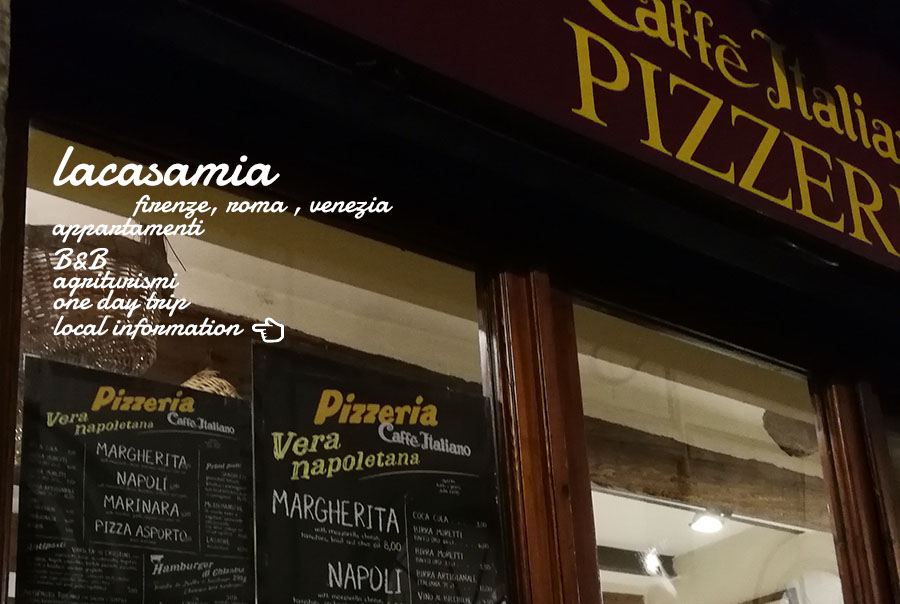 Pizza Asporto(ピッツァアスポルト)7ユーロというのはテイクアウト。テイクアウトをしたいことを伝え、好きなピザを選んで外で待っていると、焼けたら合図をしてくれます。箱に入れてくれるので、アパートに持ち帰って食べるのも良いですね、ちなみに、このピザ屋の上に、アパート、サンマルコとサンタクローチェがあります。
